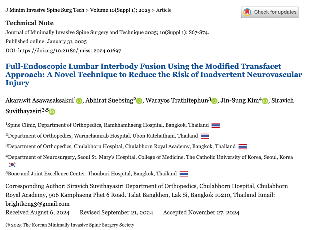 This video article is a technical note that introduces a novel transfacet approach for full endoscopic lumbar fusion surgery. It addresses the limitations of traditional techniques — such as the risk of nerve injury in the Kambin’s triangle approach and partial facet joint removal in the interlaminar approach — by enabling cage insertion while partially preserving the facet joint.